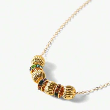 The Radiant Bead Charm Necklace is a striking fusion of playful elegance and timeless design. Set on a fine gold chain, the necklace features a series of sculpted gold beads accented with jewel-toned details in emerald green and deep garnet hues. Each bead reflects light beautifully, creating a dynamic and eye-catching effect. Perfect for